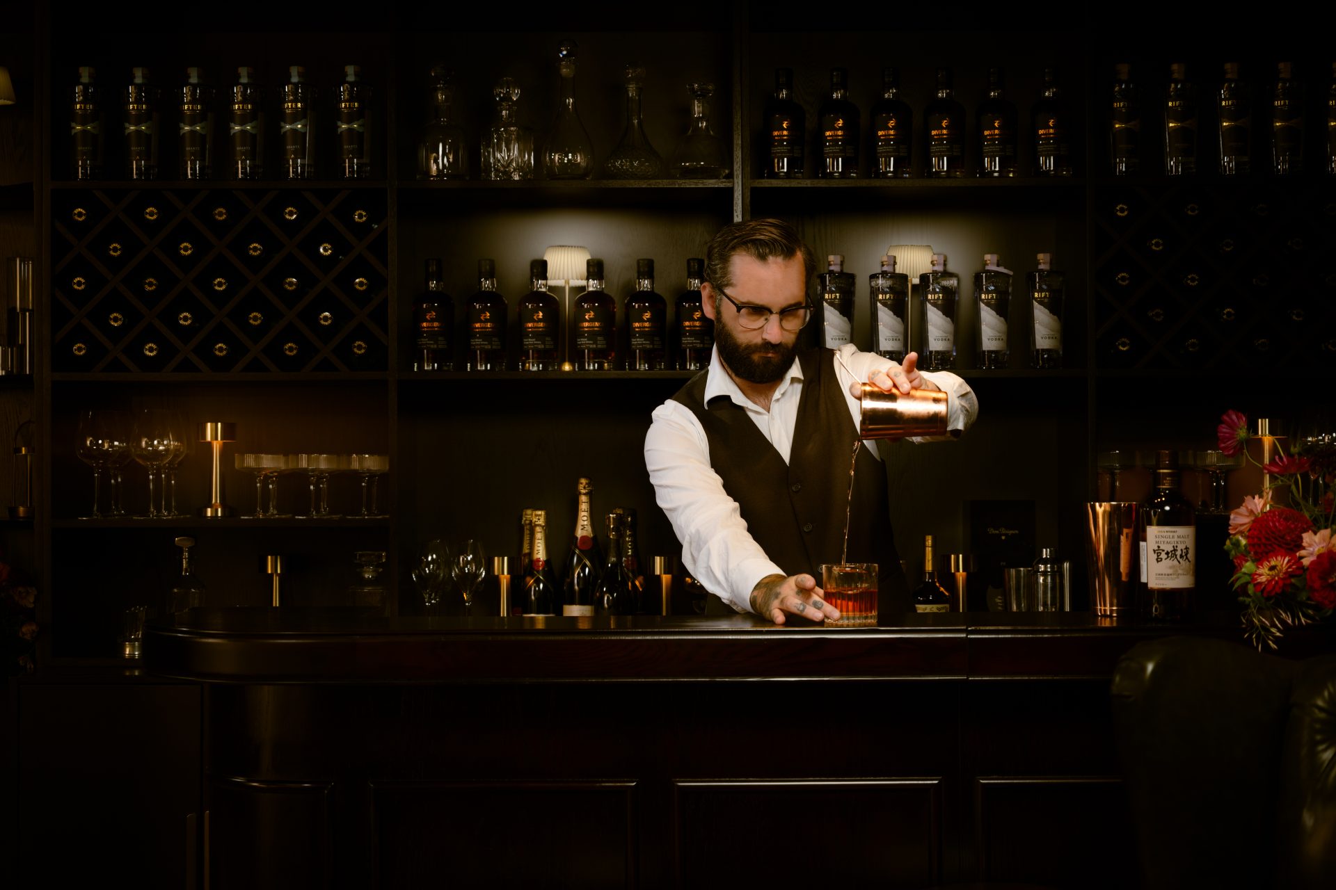 Once a flax steaming vat, now a luxurious whiskey lounge with dark wood décor, olive leather chesterfields, custom lighting, and a full bar — perfect for intimate gatherings or as part of your event booking.